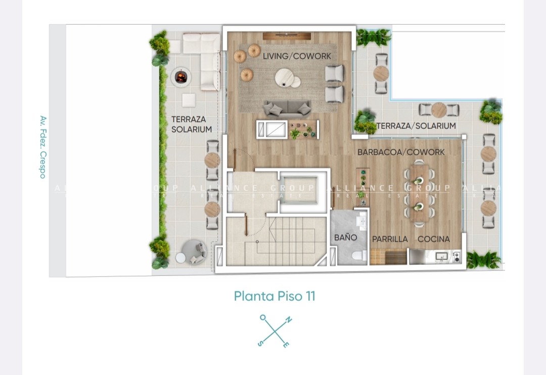 En el piso 11 dispone de SUM con living para co-work, estar con parrillero, barra y doble terraza solarium panoramicas