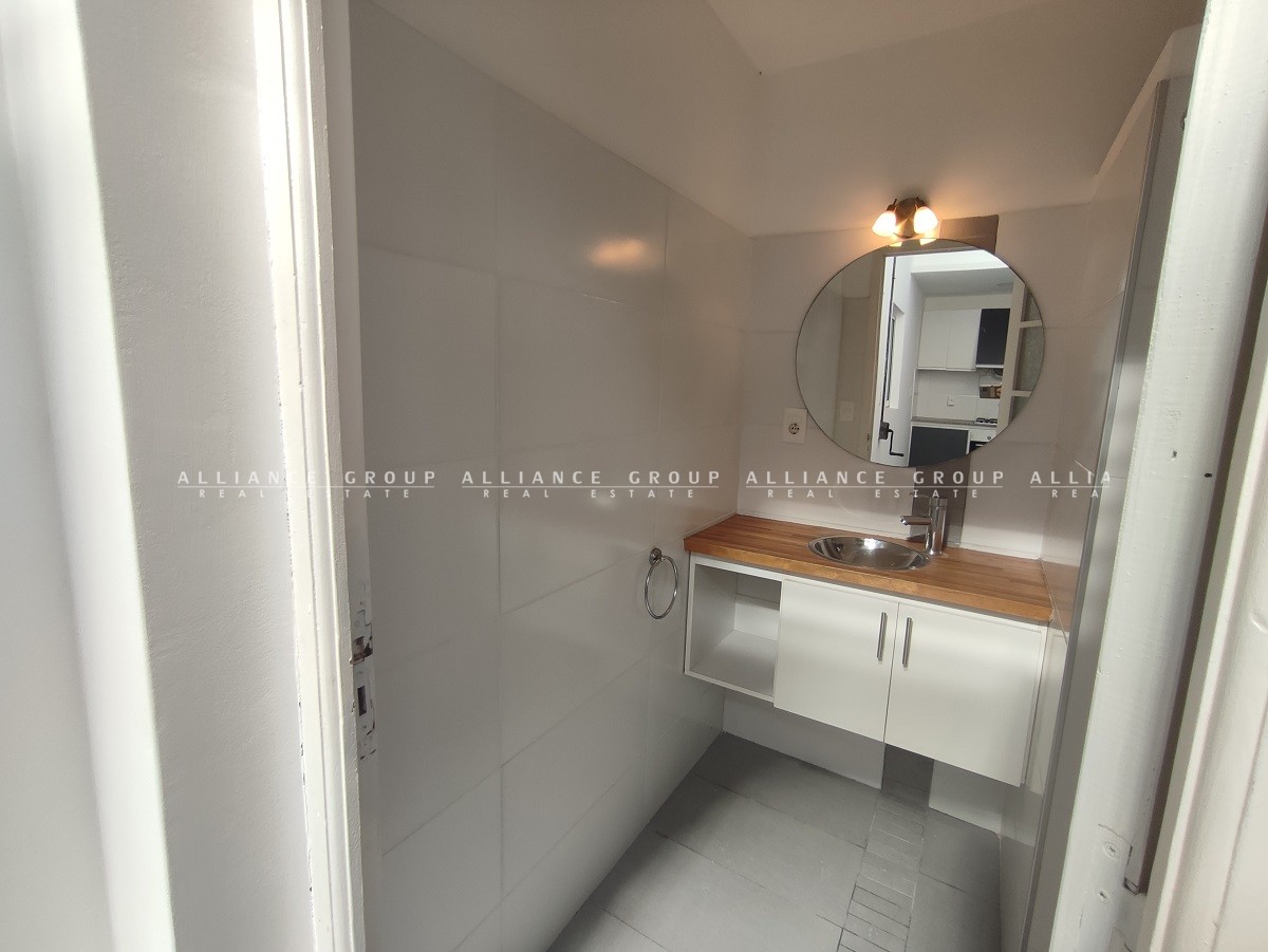 Baño a nuevo con bacha, mueble y ventana con ventilación y luz natural.