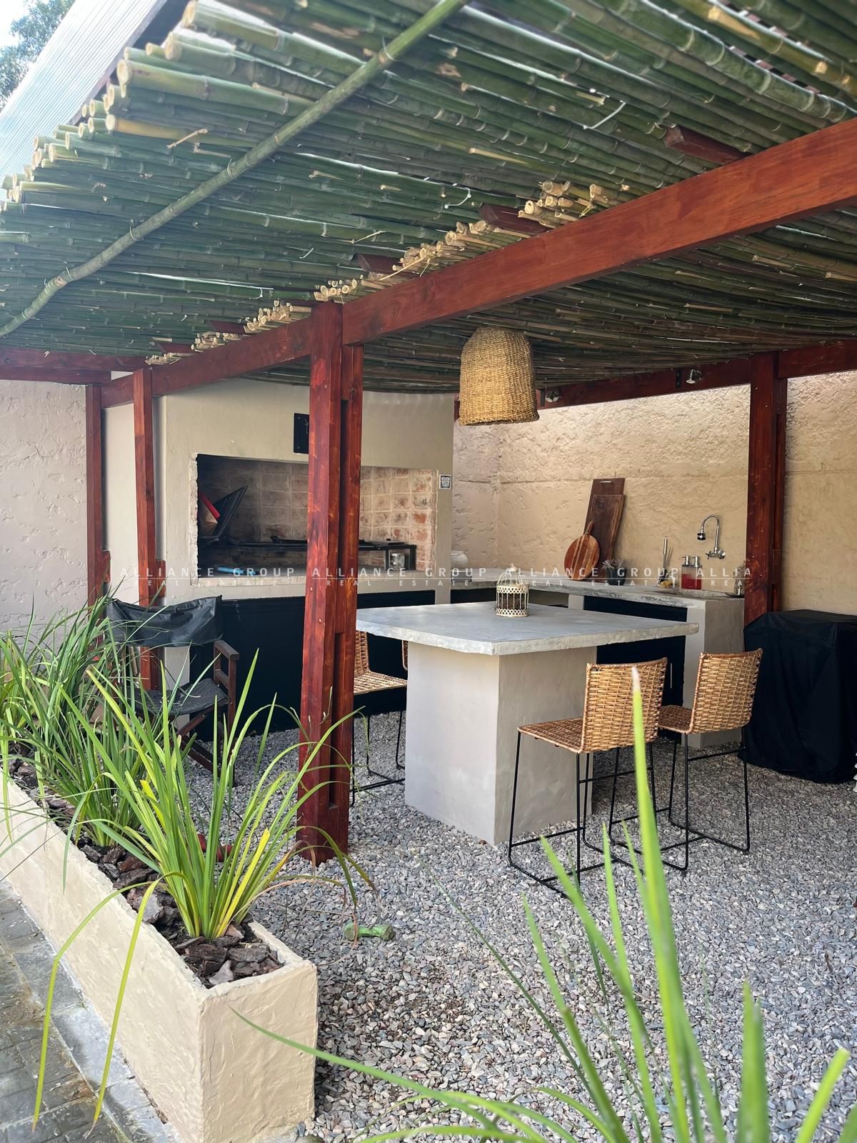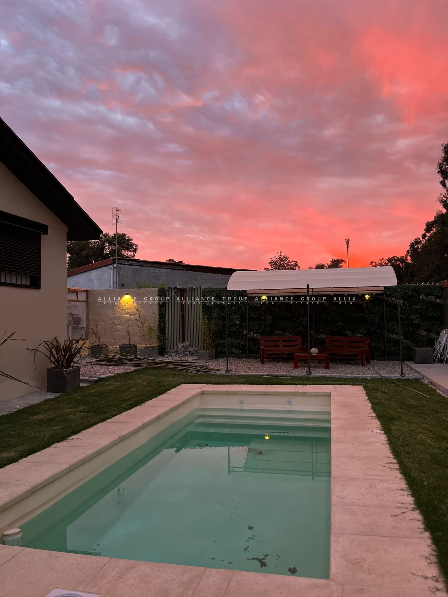 Una barbacoa techada con barra y mucha luminaria que ambienta en la noche. Piscina en posición central rodeada de una galería techada.