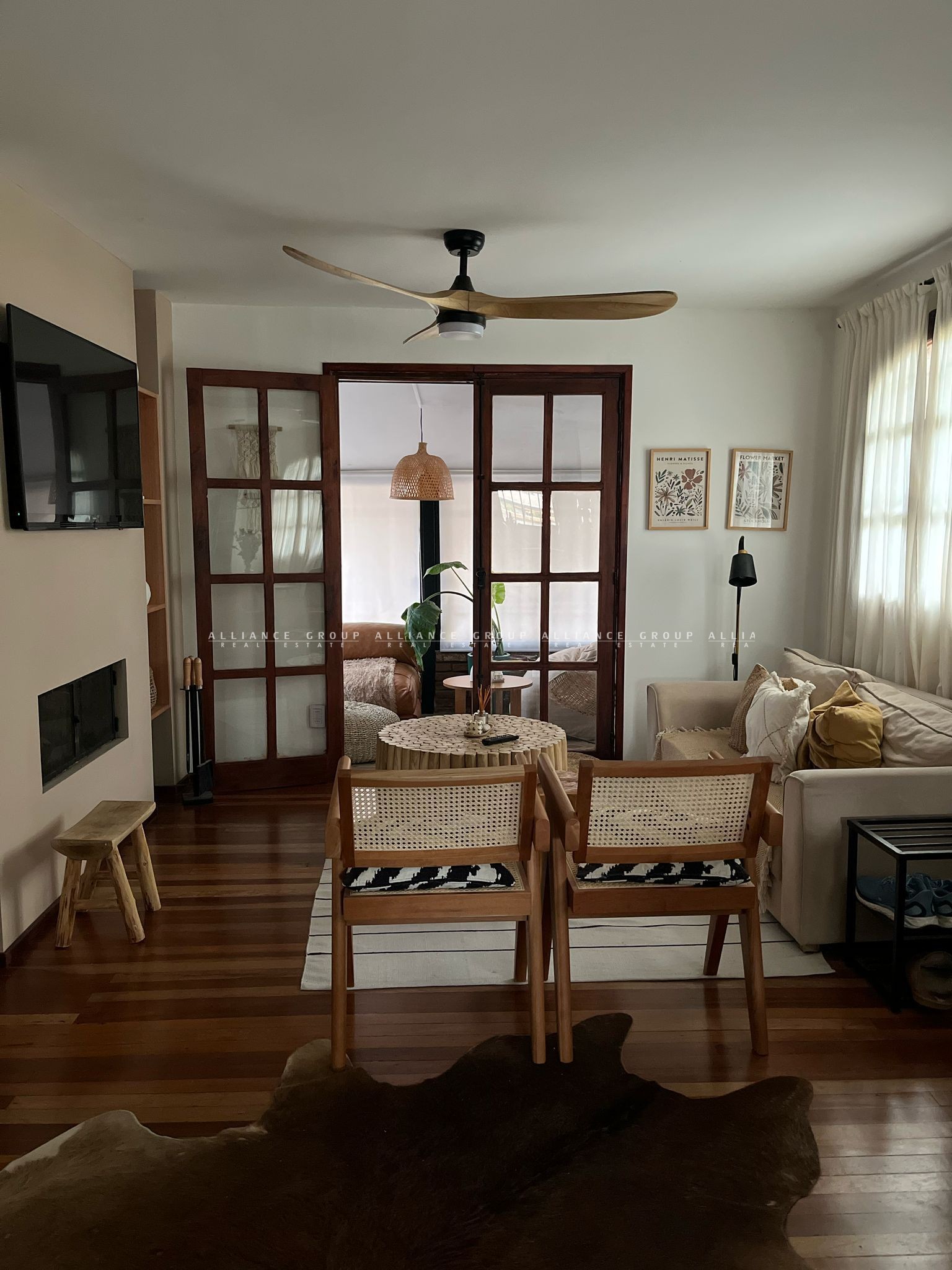 Living con estufa hogar clásica, muy buenas entradas de luz, pisos de madera y el espacio abierto a la cocina.