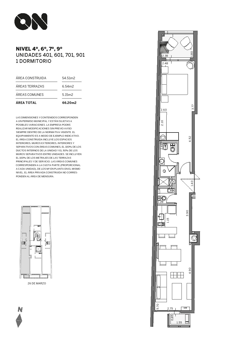 La publicación corresponde a la unidad 401 que tiene una superficie de 66m2 incluyendo terrazas y áreas comunes.