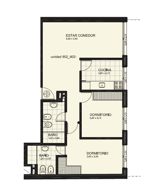 Apartamento de 2 dormitorios, living comedor, 2 baños, 1 en suite. Cocina definida.