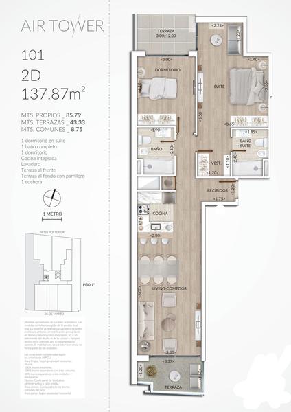 Esta unidad de 2 dormitorios al frente con amplio patio y parrillero propio, cuenta con cocina integrada, baño en suite y placard en el dormitorios