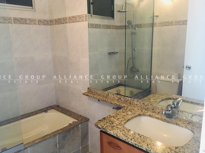Baño principal en posición central con jaccuzzi, media mampara, ducha combinada y mueble bajo mesada