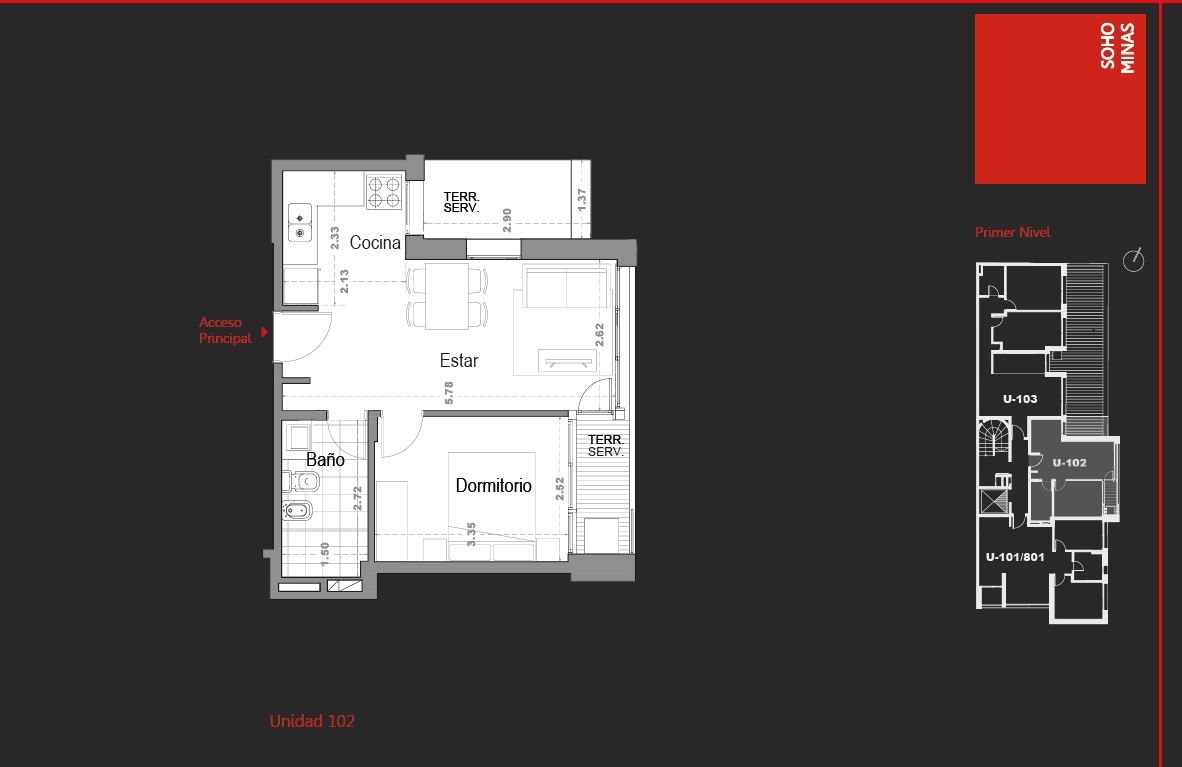 Living con cocina integrada, pero definida en su espacio con posibilidad de generar cerramiento de la misma