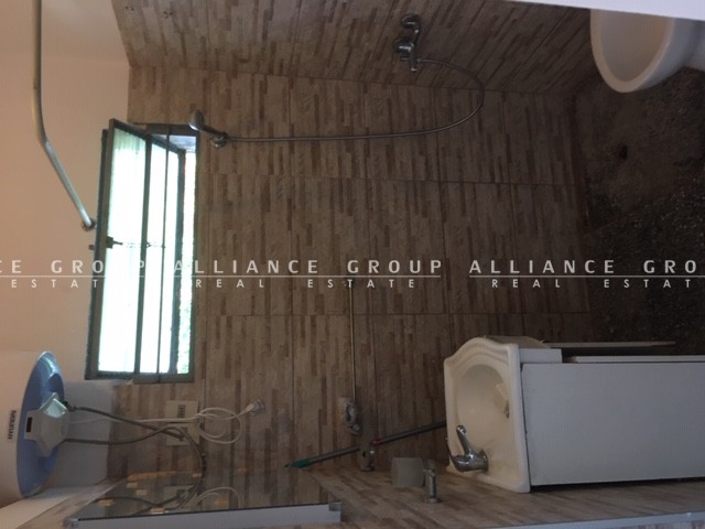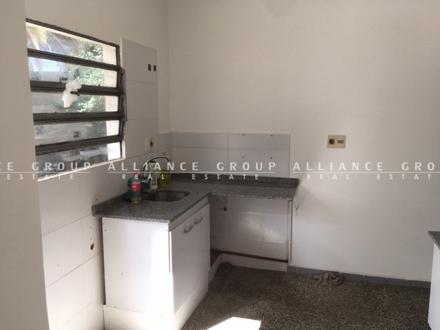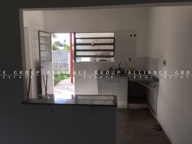 Cocina americana con barra y baño con luz natural, ambos en buen estado