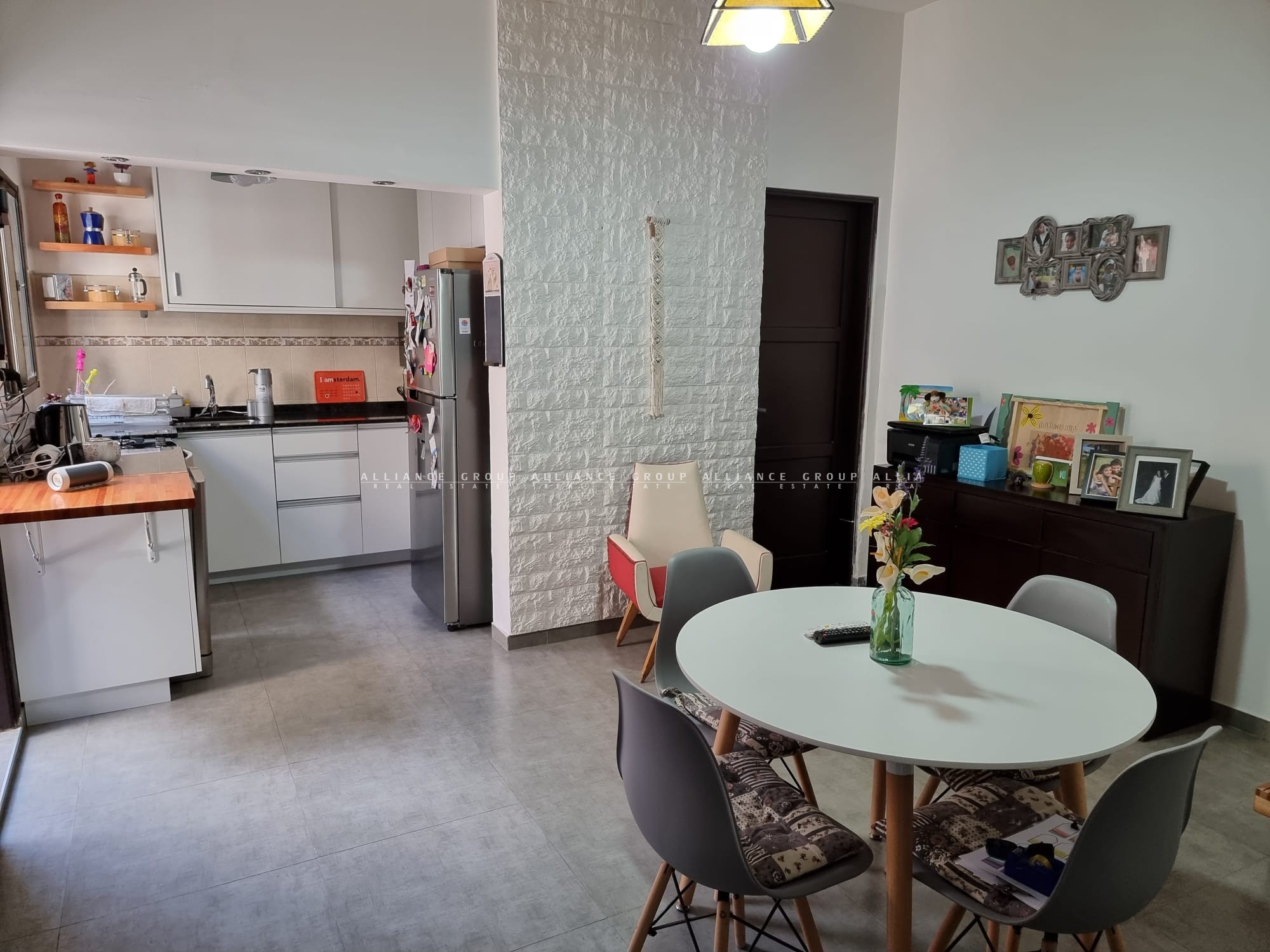 A la planta baja se accede por un pequeño despojador, el cual se enfrenta con en el living de buen tamaño que da al frente, seguido se llega hasta el comedor o estar diario conjuntamente con la cocina, la que es definida, pero abierta a todo este espacio social, generando mucha armonía en este ambiente.