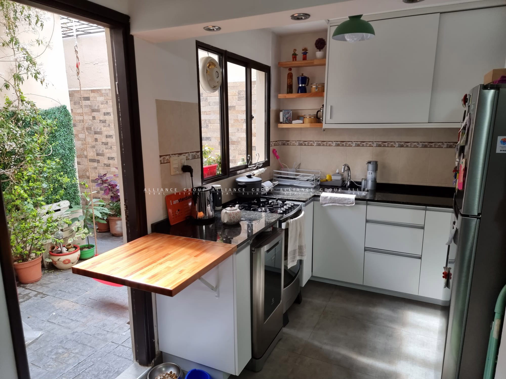 La cocina con impecable estado y gran capacidad de muebles, ya sea sobre como bajo mesada con todas las puertas y cajoneras de cierres amortiguados. Mesada en L de granito lustrado y bacha de acero inoxidable con monocomando. Posición de heladera definida y cocina con su correspondiente extractor instalado, dicroicas empotradas en bajo techo. Desde este sector, también se puede acceder a un patio abierto con mucha luz y jardinería vertical, siendo una expanción para este nivel. El baño secundario que es completo y con extracción.